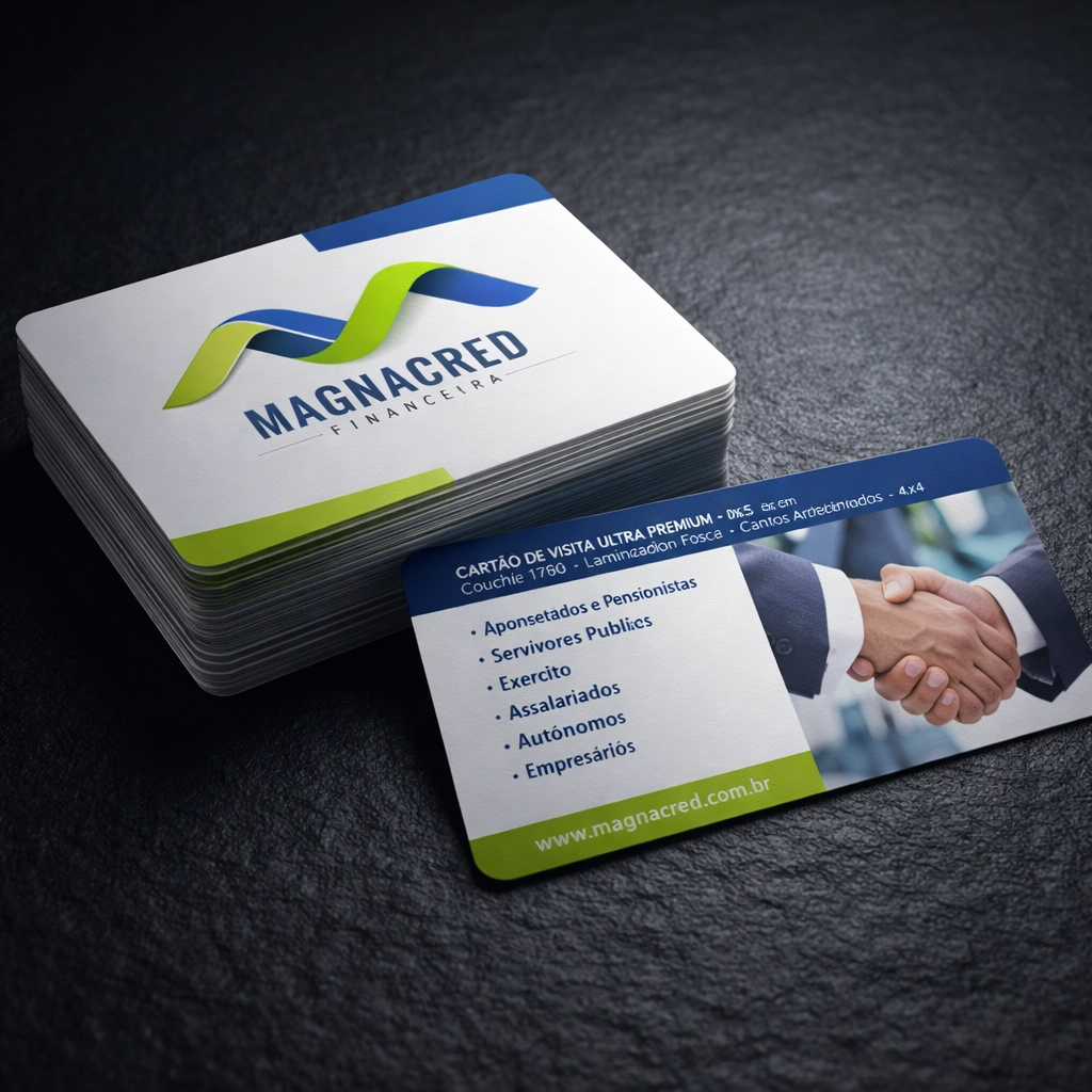 Couché 700g, laminação fosca, cantos arredondados e frente e verso coloridos. Se você busca a especificação técnica mais alta do mercado, este é o seu cartão. Qualidade absoluta em cada detalhe